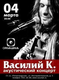 ВАСИЛИЙ К. - яркий представитель музыкального андеграунда. В конце 1990-х, проживая в Швеции, организовал экспериментальный проект Василий К. & the Kurtens, успешно концертирующий, выпустивший несколько альбомов на "Lem Records". С 2002 г. перенес свою музыкальную деятельность в Россию и сейчас живет в Москве. В 2004 году собрал новую группу с ироничным названием Василий К. & Интеллигенты, погрузился в атмосферу творческой лаборатории, и проявляет себя в самых разных музыкальных стилях: традиционный рок, электро-клэш, акустическая психоделика.