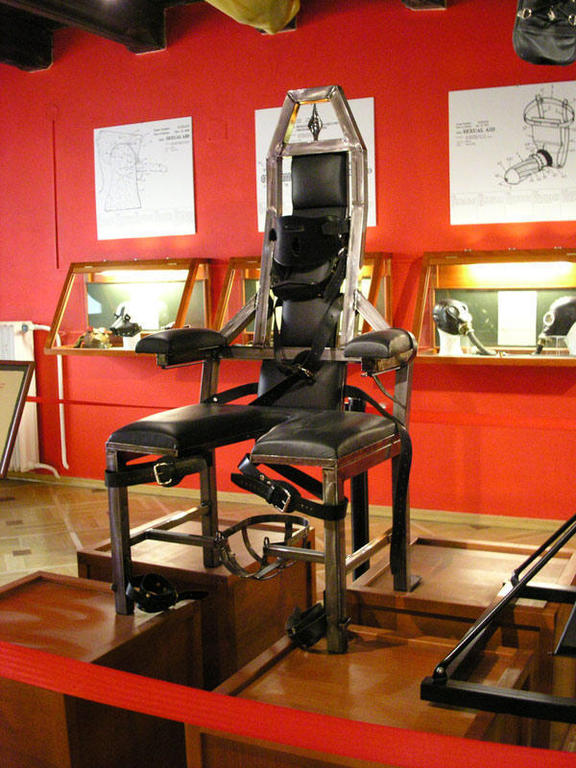 Все в красных тонах, помимо секс-приборов, выставленных вживую, внешний вид некоторых других вывешен на больших плакатах с подробным описанием устройства и действия. На первом этаже выставлено старинное кружевное белье и ночнушки с вырезами в нужных местах. На втором и третьем стульчаки для золотого дождя, ночные горшки, пояса верности, приспособления против женской и мужской мастурбации и отголоски современности в виде вибраторов нашего времени, кресел для утех и тд. Запомнились мрачные металлические фаллоимитаторы начала 20 века с ручным приводом как у советской ручной дрели и злобные приспособы против мужеской подростковой дрочильни. На член одевается специальный чехол, который соединен проводами с электрическим ящиком. И в случае возбуждения пениса поднадзорного до «ненужного» размера, в комнате родителей загорается лампочка и включается зуммер. Также представлен образец на случай отсутствия предков дома. Здесь все проще, охочего пацана просто бьет током по отростку. Верхний этаж отдан для садо- и прочих игрушек и станков, расставленных по залу и подвешенных под потолком. По витринам рассредоточены фаллосы резиновые и не очень и прочие пихательно-стимулирующие гаджеты. Ничего удивительного, вещи из сексшопов. На третьем этаже имеются туалеты, эМ и Жо, для быстрого приведения себя в умиротворенное состояние. Причем на женской кабинке замечено написанное маркером послание формата А4 с начальным словом «POZOR!», что гласило по-нашенски что-то типа «внимание, очко не исправно». А из-за двери доносились звуки, свидетельствующие об утолении кого-то из экскурсантов возникшего от увиденного желания.