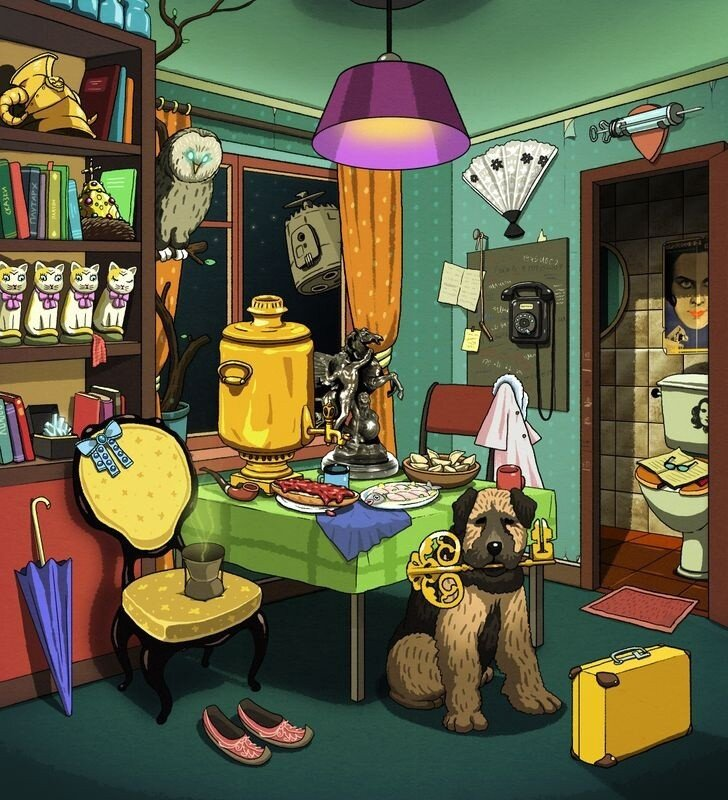 Самовар, белое платье, доска с телефоном (Весна 1948 г. или Место встречи изменить нельзя?), самовар, книги, два портрета в сортире, банки - х.з.