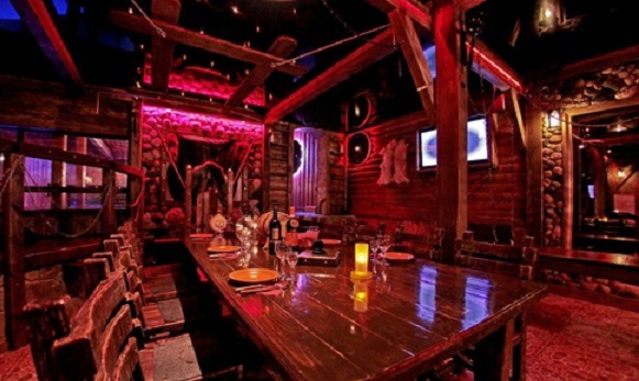 Антураж сауны средневиковье, везде развешено холодное оружие, кандалы и т.д.