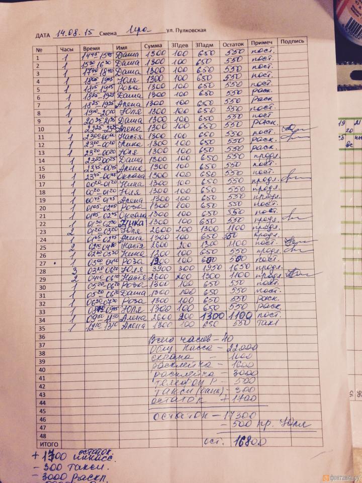 Бесперебойность конвейера обеспечивали мигранты, южане-россияне и жильцы Пулковской, 2. Их в бухгалтерских документах обозначали словом «сосед». Велась и база постоянных клиентов, с телефонами и домашними адресами (те, кто заказывал на выезд). Негодяев вносили в черные списки, в которых градация была предельно четкой: просто «козлы» и те, кто заставляет не предохраняться, – в записях это обозначалось как "рвет" (презевативы; слово изменено).
