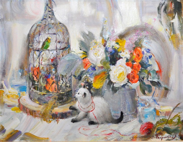 Людмила Бирюкова, "Натюрморт с попугаем, котенком и цветами"