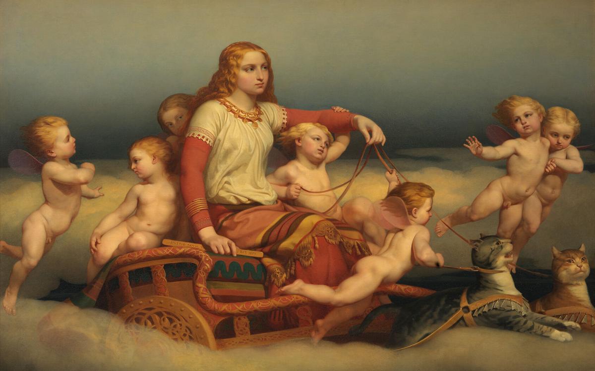 Кошки как упряжные животные богини Фрейи на картине Нильса Бломмера.