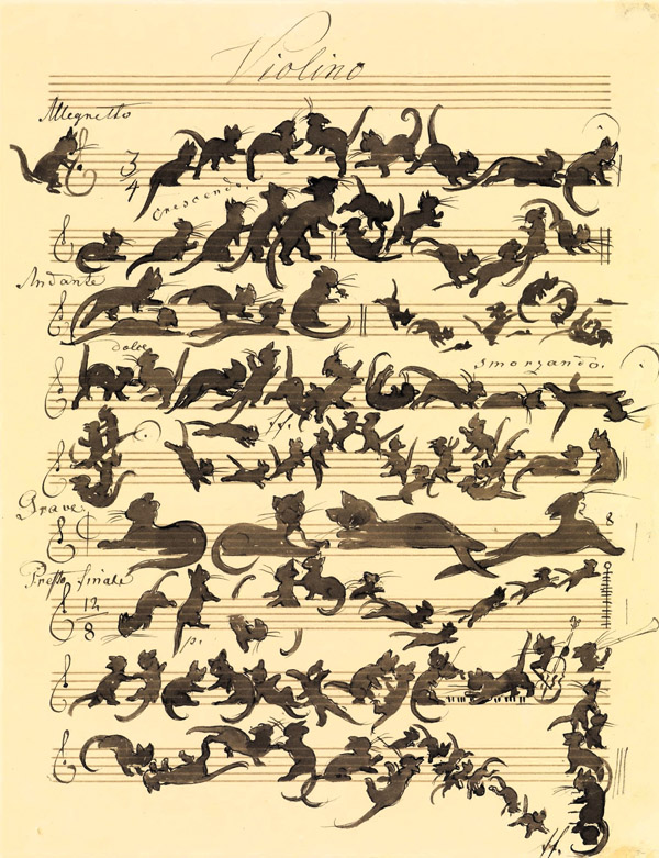 Картина представляет собой шутливое изображение мелодии для скрипки. И её действительно можно исполнить! Кошачьи силуэты определенно опираются на конкретные ноты на нотном стане.