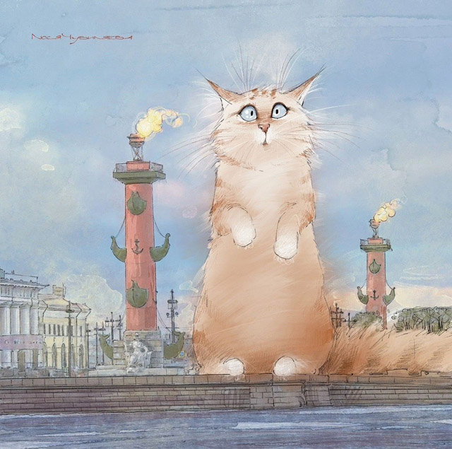Хотя у Пушкина Кот Ученый ходит вправо-влево, в русской мифологии он ходит вверх-вниз. И не по дереву, а по железному столбу.