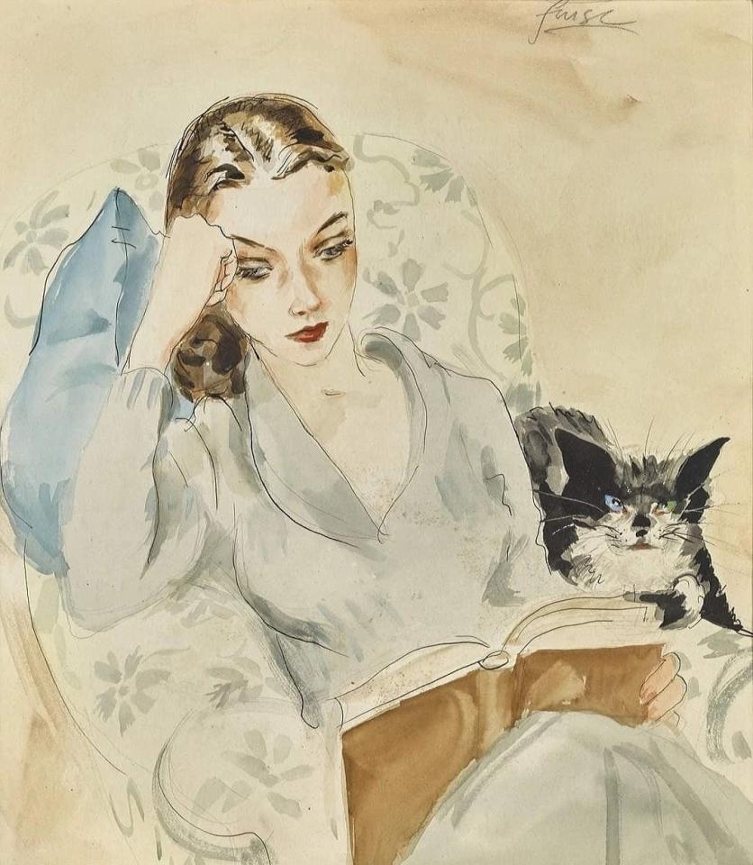 Роджер Фёрс (Roger K. Furse; 1903-1972). Читающая Вивьен Ли и Тисси. 1941. Бумага, акварель. Из личной коллекции Вивьен Ли. Частное собрание