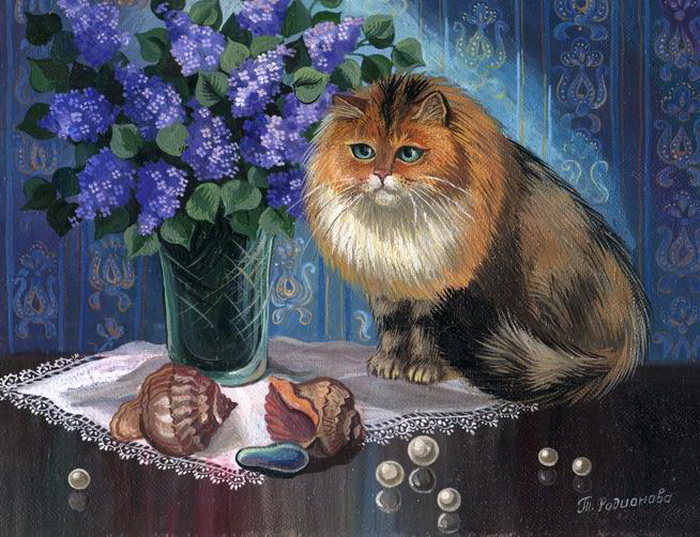 Я живу в пригороде Петербурга. У меня 5 кошек. Все они живут на свободе, т.е. когда хотят приходят, когда хотят уходят иногда надолго. Зимой приводят своих друзей подхарчиться. И служат для меня источником вдохновения. Рисовать я училась в художественной школе при институте Репина в Петербурге. После окончания школы я поняла, что рисовать я не хочу и не буду, и поступила в Университет на математико-механический факультет. Потом работала программисткой в одной очень закрытой конторе. Однажды мне подарили подборку стихов о кошках и мне очень захотелось проиллюстрировать эти стихи. Вот так все и началось. Вот уже лет восемь я рисую кошек. В 2005 году я принимала участие в традиционной Петербургской выставке "Мартовские коты". Она проходила в выставочном зале "Каретный" в ЦПКО в марте месяце. Я считаю, что имела большой успех. Не думаю, что ЦПКО в марте посещает много народа: слякоть. Тем не менее за две недели, что работала выставка, было продано около 130 моих работ небольшого формата (15х21). Семь работ было украдено. Это тоже мне сильно польстило: плохие работы красть не станут".