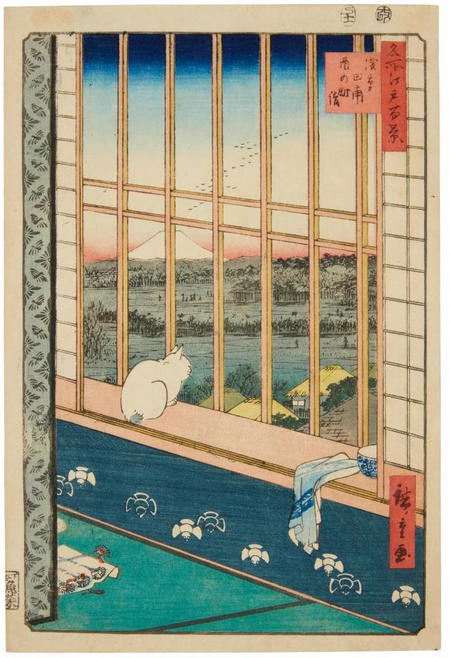 - Сквозь окно котик может обозревать гору Фудзи. По тому, с какого ракурса изображена гора, знающий Токио может понять, в какой части города города сидит котик. А если человек в силах разобрать иерогифы, он может просто прочитать надписи на гравюре: котик обитает в квартале Асакуса. Квартал Асакуса считался кварталом гейш и разнообразных увеселительных заведений.