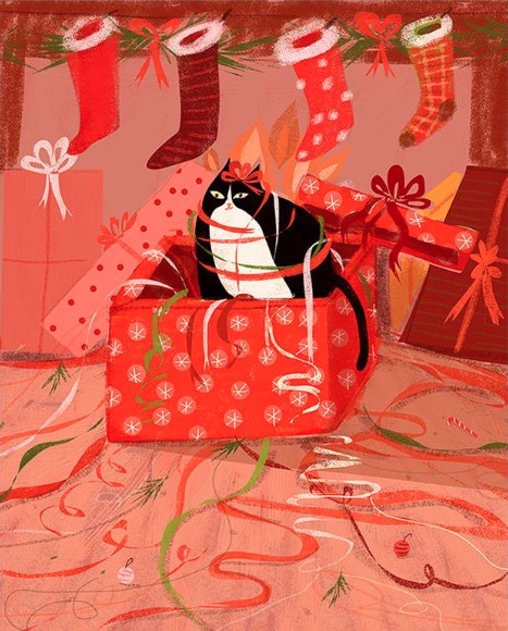 - На то, что котик изображён во время Фестиваля петуха (это что-то вроде нашего Дня урожая), указывают лежащие в комнате грошечные грабли - они предназначены для ритуального загребания счастья во время этого самого фестиваля (и если вы бывали в Японии - возможно, у вас есть такой сувенир