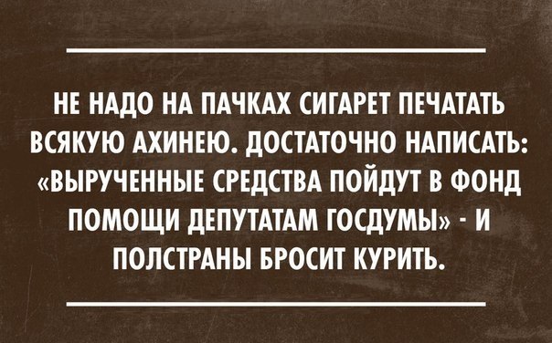 Пойти навстречу миллионам курящих путешественников - соотечественников и гостей нашей страны, обеспечить равные возможности для всех. Для этого необходимо внести необходимые поправки в антитабачный закон, предусматривающие разрешение курения в аэропортовых комплексах России в современных закрытых, специально оборудованных для этого помещениях.(с)