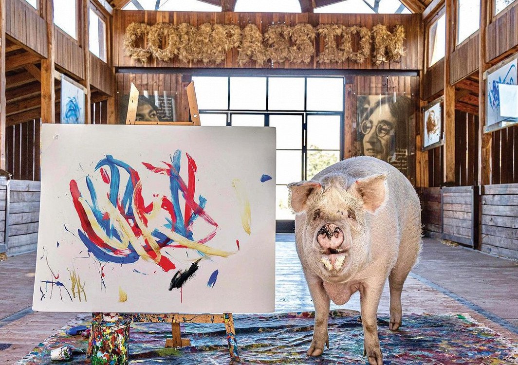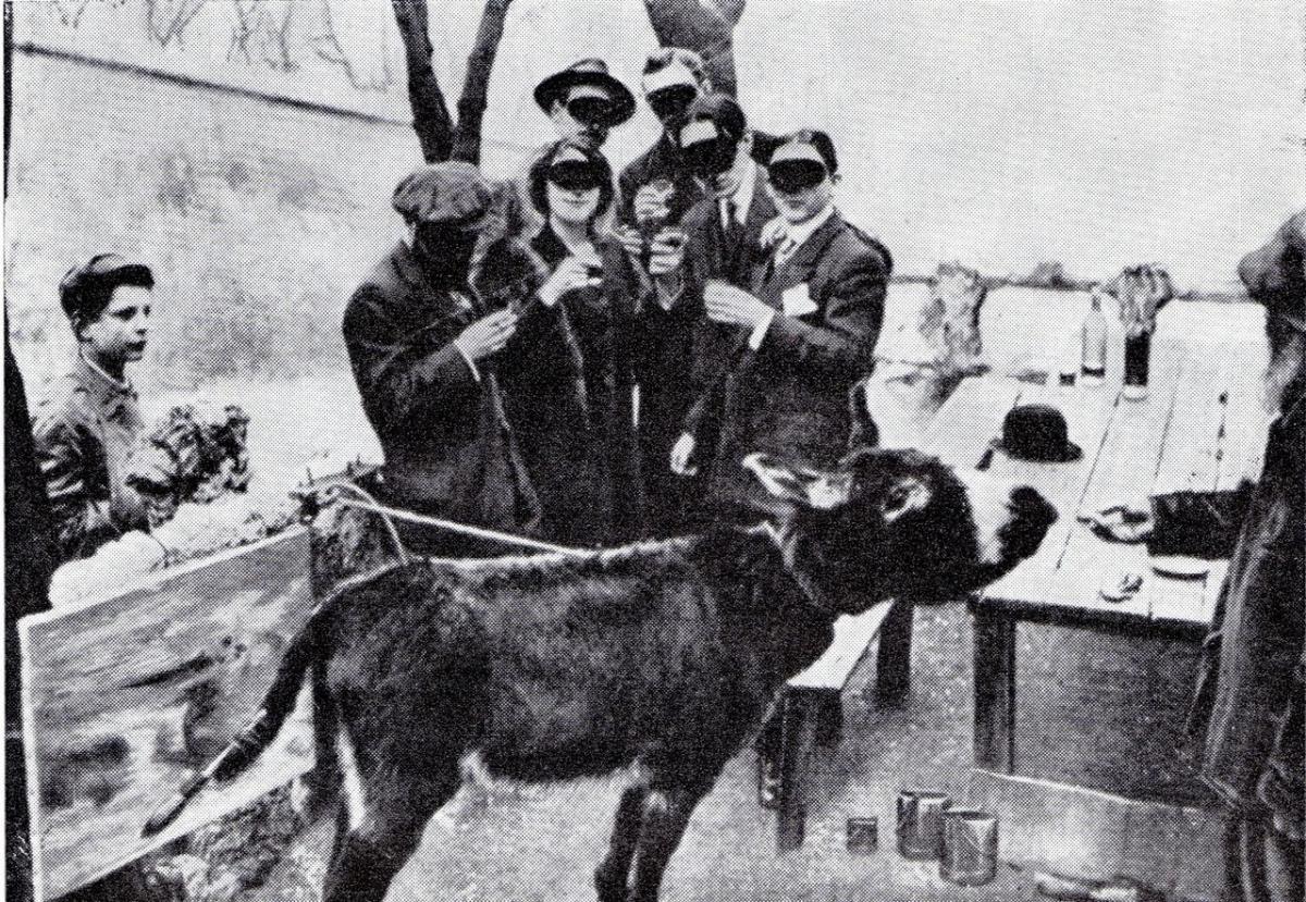 Оказывается, она восходит к реальному случаю. Один художник (Ж.Боронали), исчерпав фантазию насчет новых модернистских приемов, устроил такой перформанс - сначала выставил картину "Заход солнца над Адриатикой", а через некоторое время признался, каким методом она была написана