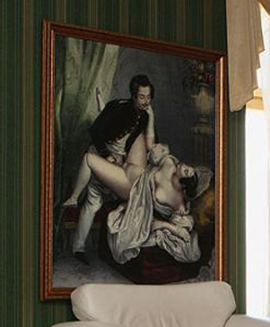 Картина "неизвестного автора" изображает офицера примерно времён войны с Наполеоном, который стоя собирается присунуть пухлой даме развалившейся поперек кресла. При этом офицер нежно смотрит на даму, а дама наверно от блаженства как бы парит в воздухе. Думаю, картина страдает исторической неточностью, т.к. у дамы выбрит лобок, а в те времена делать это очевидно считалось верхом неприличия. Художник изобразил также и орудие любви офицера. Но изобразил его каким-то с виду маленьким. Это вызывает двоякое ощущение. С одной стороны картина сразу становится как-то не очень развратна и эффектна, с другой стороны не вызывает комплексов от сравнения своего собственного орудия с тем, что на картине.