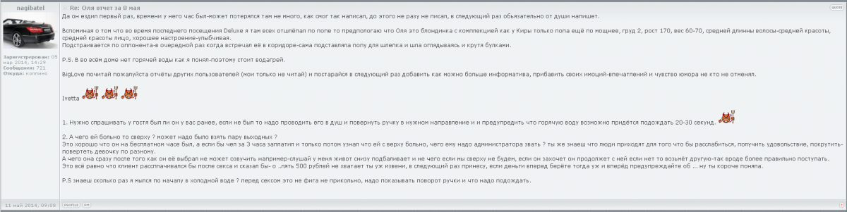 Знаком с Му-Му лет как 4-5, не жалую их после того как стали тихарить от меня анальных дев, плюс за наебку связанную с акцией (не помню название акции), но могу сказать, что меня ни разу не наебали там на время, ни разу не положили в а-ля коридор, ни разу не подложили под меня бревно вместо девки, исправно поили чаем. Для справки был там с учетом их бывшего офиса на Невском и Просвете (ездил к анальной дыре Изабелле Кларк) раз 15-20.