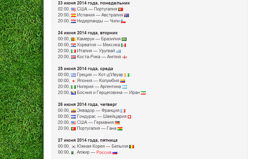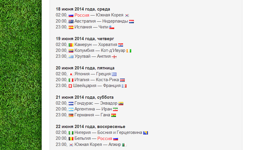 Расписание матчей. Первый матч начнётся аж в 2 часа ночи. Придётся приложить массу усилий, чтобы дожить до этого времени, а потом ещё подняться утром и пойти на работу.