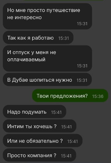 Как многие знают неделю назад я закинул удочки на махнем.ру и ловлю всякие чудеса. Попался бриллиант. Дева Настя, 30 лет отроду, с уже купленными билетами в Дубай на воскресенье. Мило пообщались в телеге, договорились что я ее встречу и решим что и как. Цитирую от нее "Что ожидаешь от девушки? Кроме интересного общения и классного секса)". В штанах ощутилось напряжение.