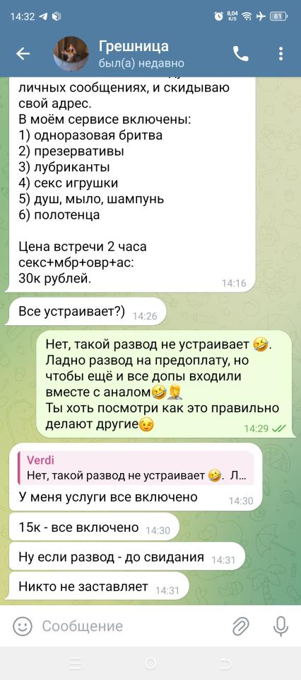 За 20 минут просит перенести на полчасика – фиг с ним, ок. Приехал, отписался. Ответила, что вот-вот спустится. Я спросил – зачем. Далее выяснилось, что у неё типа «нет места», а это типа подруга неверно в анкете указала. Устраивать экшен в машине или срочно искать почасовой постой у меня не было ни малейшего желания. Не знаю, как есть на самом деле, может этот какой-то временный косяк, потому что это ну очень странно звать к себе кого-то, и объявлять, что места нет только непосредственно перед встречей.