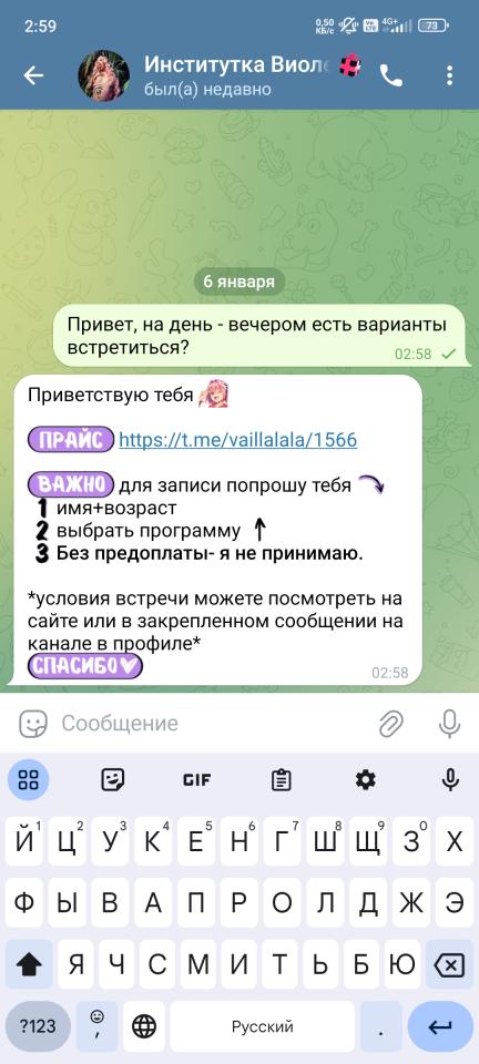 Был я у этой Виолетты летом 2023 года. Слежу за ее тг каналом. Поэтому в данном случае я считаю, что это не развод и встреча действительно состоится в случае внесения предоплаты.