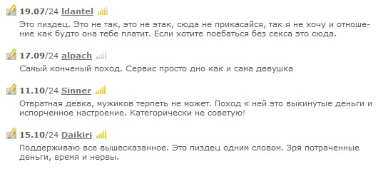 LW все правильно ответил, я, естественно, не бабка Ванга, но по шлюшьим анкетам плюс минус научился определять, уж по крайней мере денег авансом точно не засылал. В процессе - да, было такое, вроде и уплочено, но выходишь с чувством что не ты, а тебя выебали, а точнее не выебали, а наебали. И ещё момент - мониторю все эти шлюшьи чаты, сейчас у каждой шалашовки приватка, хуятка, всякие анонимайзеры и пробивали, и один хер они даже друг друга в различные ЧС заносят. Хотя шлюшьий профсоюз, как мне показалось, на данный момент намного сильнее ходковского...