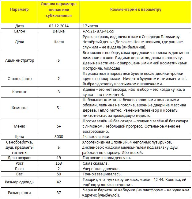 Весьма рекомендую любителям молодого тела, не рыхлых сисек среднего (любимого мной) размера. Если останется в АМ – пройдя круг по салонам, вернусь. Надеюсь, опыта наберётся. В дёгочной ложке у меня остались безынициативность молодости и курение.