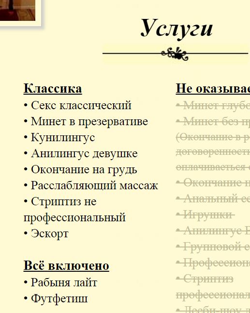 Заводится с пол оборота, мгновенно нарастает возбуждение, течет обильно. ОС(5) со знанием, навыками и желанием все отлично! Окрестности довольны; разнообразно, глубоко, внимательно к пожеланиям. КС(5) отличный аналоговый процесс со взаимным удовольствием. Стандартные позы легко, гибкая.