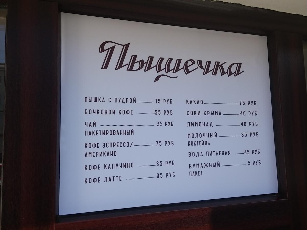 Идеология - имитация советской пышечной. Основные блюда - пышки по 15 рублей и бочковой кофе (сразу со сгущенкой) по 35. Есть, кажется, больше нечего, а из напитков еще присутствуют кофе из эспрессо-автомата, соки, лимонад и чай...
