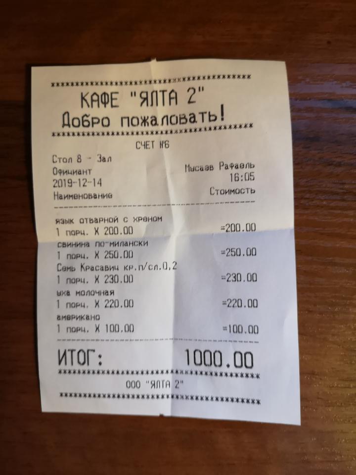 Самое приятное - счет в 1000 рублей, да еще 100 оставил на чай. Но, если бы не брал вина, уложился бы в тысячу.