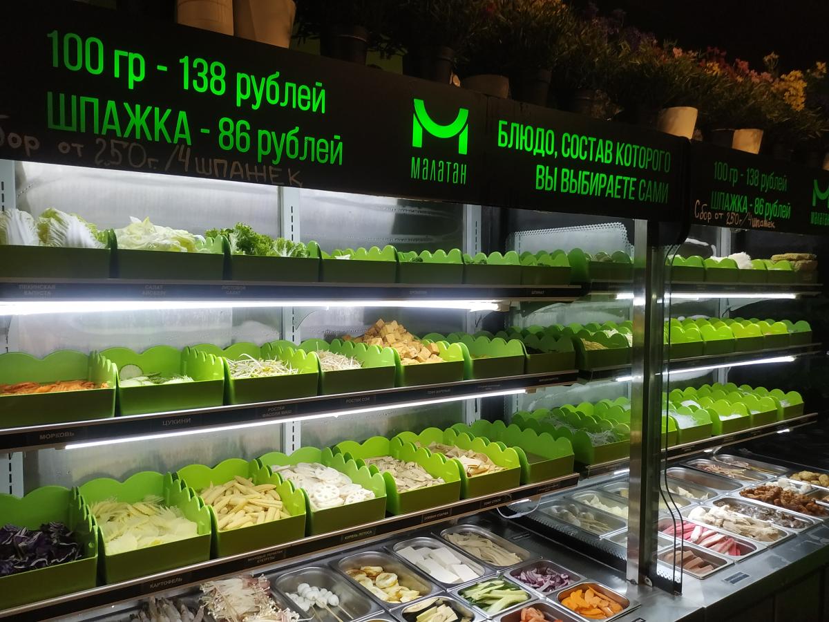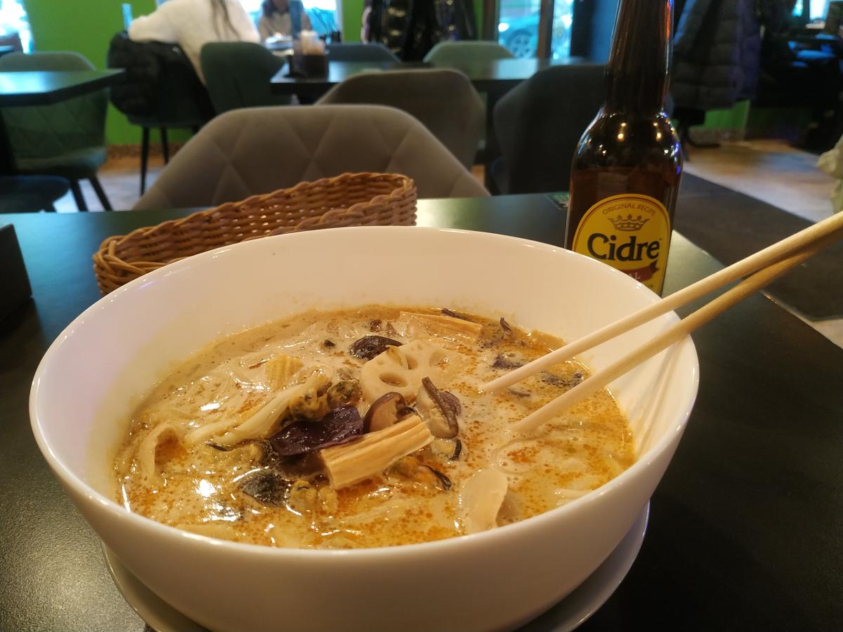 Зашёл пообедать. Концепция едальни не то чтобы привычная. Сам себе собираешь блюда. Т.е берёж миску с щипцами и хватаешь с полки всё что хочешь. Затем приносишь на кассу, и повара тебе готовят то что набрал, пожарят или сварят суп (бульоны сливочный, острый сливочный и томатный на выбор). Гарсон Дмитрий всё подробно распесал. Минимальный заказ на 250р. Но я конечно набрал в тазик хрючева на 575р, накидал всего подряд: лапша, мидии, кальмары, осьминожки, грибы шиитаке, початки кукурузы, ростки сои, спаржа соевая, корень лотоса и п.р. Выбрать есть из чего, одних грибов усмотрел беглым взглядом 5 видов: вешенки, шампи, сянгу, муэр, белые древесные, грибы золотые нитки. Есть и мясо, сосиски, кура. Правда чили не было, что для азиатской кухни странно. Острый бульон не острый, а что-то на уровне евро Том-яма на кокосовом.