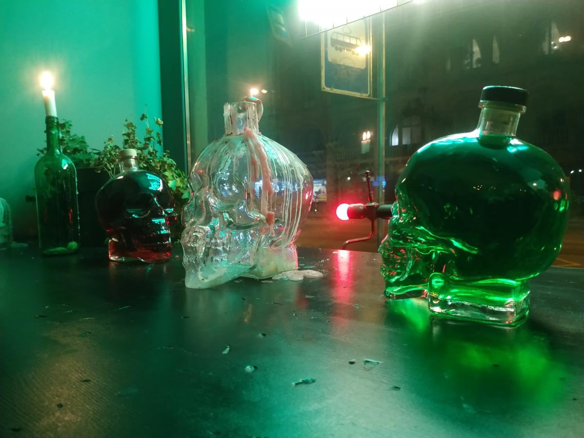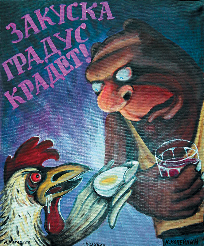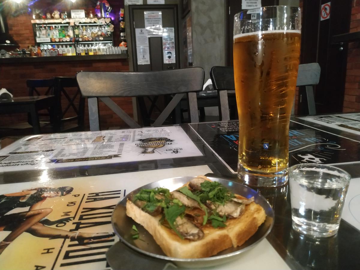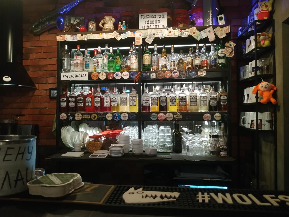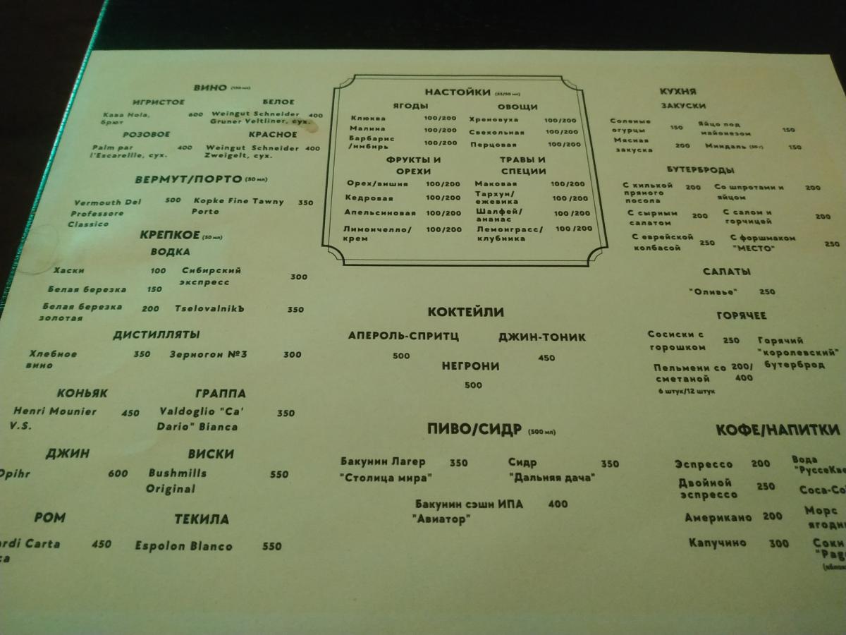 Всё по-прежнему: портреты Высоцкого, Ленина и Сталина, купюры разных стран, шарфы футбольных клубов. Заказал 50 г водки и небольшой бутерброд. 80+40, итого 120.