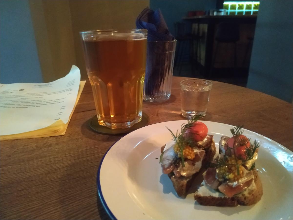 3) Бутерброд с килькой (110р) Ароматный вкусный бутер! Свежий хлеб, перепелиные яйца, килька, вяленые томаты и семена горчицы. Имеется подозрение что у них все кушанья на весьма достойном уровне.