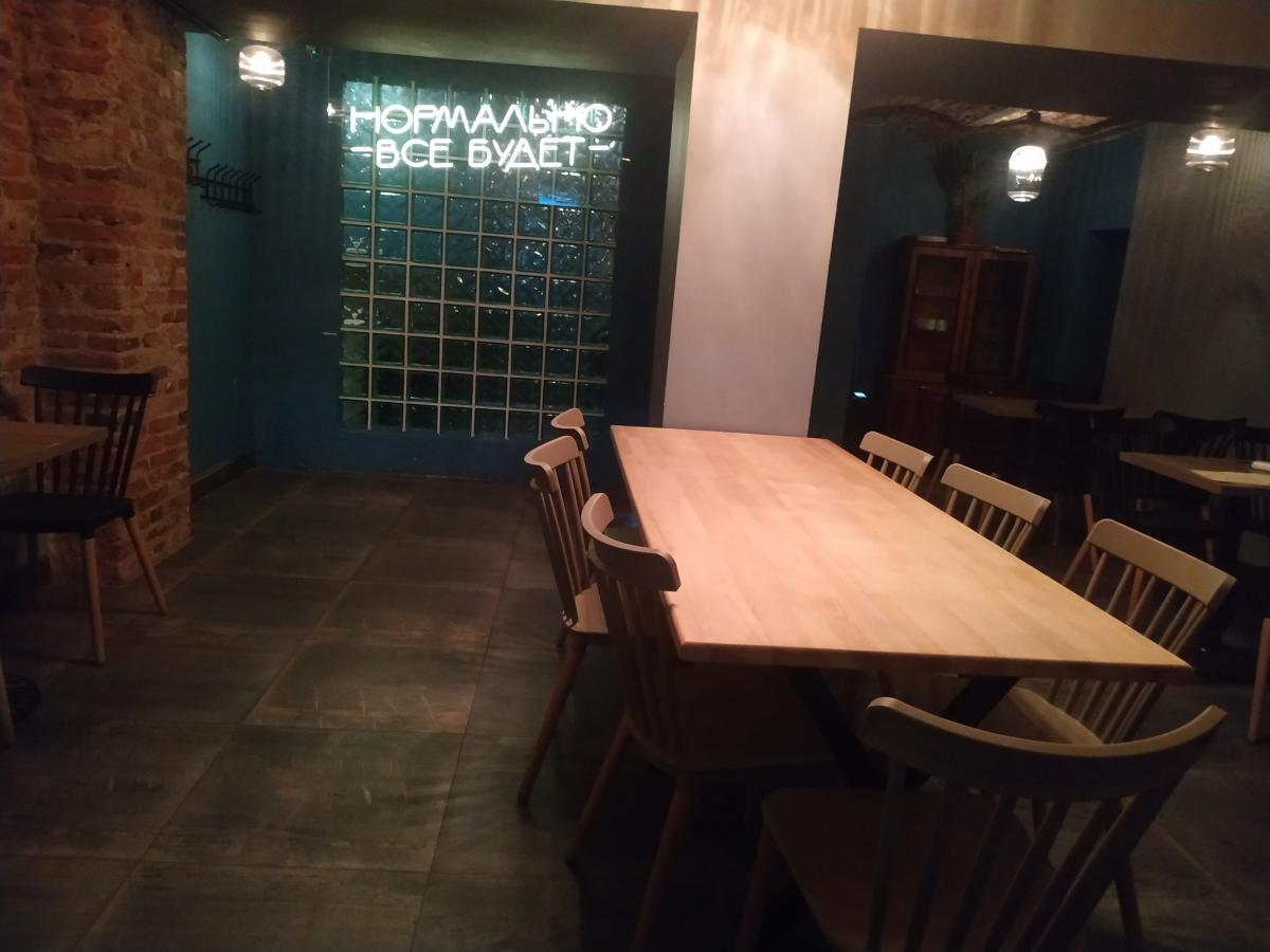 Барная стойка и отдельно зал. На входе дежурила девица в тельнике. Встречала гостей, интересовалась каким ветром, что предпочитаете. Принимает заказ, сама всё разносит. Обстановка мрачноватая, камерная, из-за тусклого освещения. В зале 1 большой стол посерёдке, человек на 7-8, а по углам столики на 4х у стены + мелкие, с барными стульями, у окон. Музыка фоном играет умеренной громкости, Грин дей, Пласебо и т.п. С/у 2 штуки, чисто. Вечер воскресенья немноголюдно.