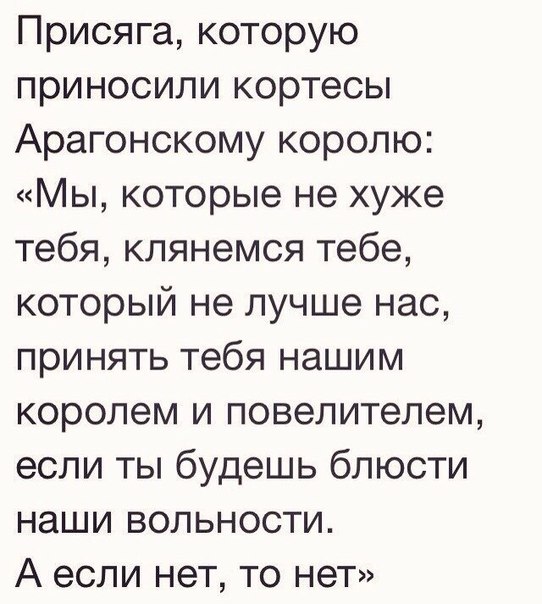 Мне очень понравился найденный где-то в интернетах кусок из присяги арагонскому королю:
